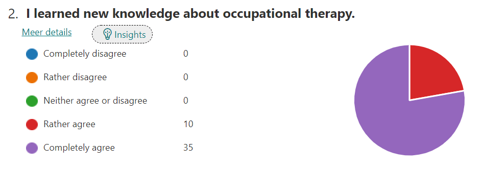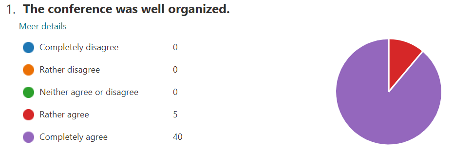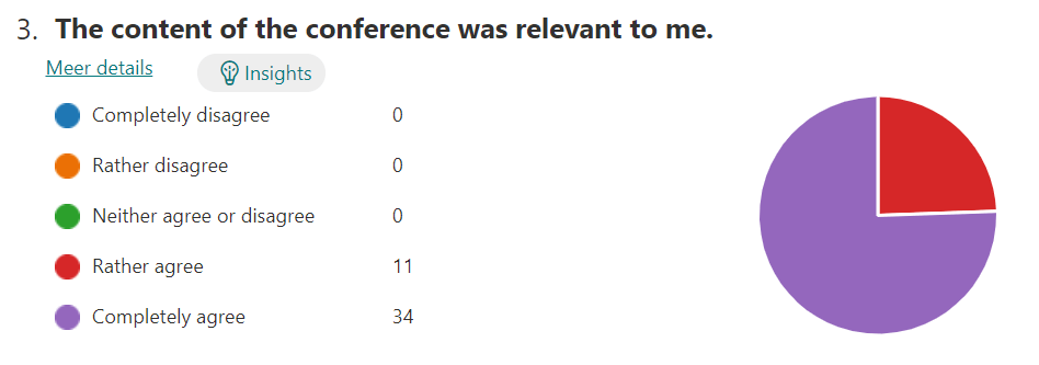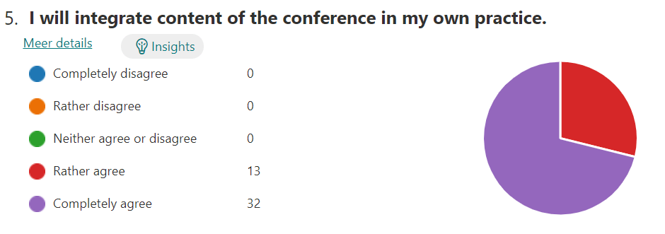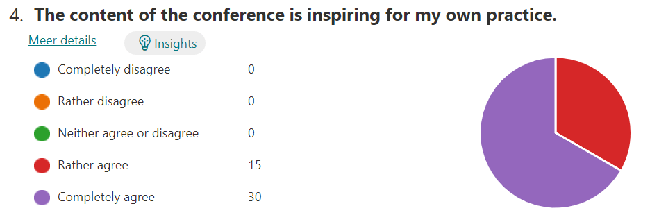In general, we saw a very positive story among the 45 respondents who completed the questionnaire about the conference. All closed questions (about the organization, new knowledge, relevance, inspiring for practice and integration in the own practice, were answered with 'Rather agree' and 'Completely agree'. A large majority indicated 'completely agree' (89% on organization, 78% on knowledge, 76% on relevance, 67% on inspiring for practice and 71% for integration in practice.) The tips/questions were also extremely positive.