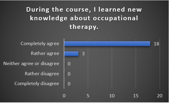 The participants agreed that the content of the course fitted their level well, but not all the participants found that the content fitted their prior knowledge. One possible reason therefore is that all the participants hold a big variation of prior knowledge. Despite that, the participants indicated that the learned new knowledge about occupational therapy during the course and that attention was paid to recent developments withing the field of occupational therapy.
