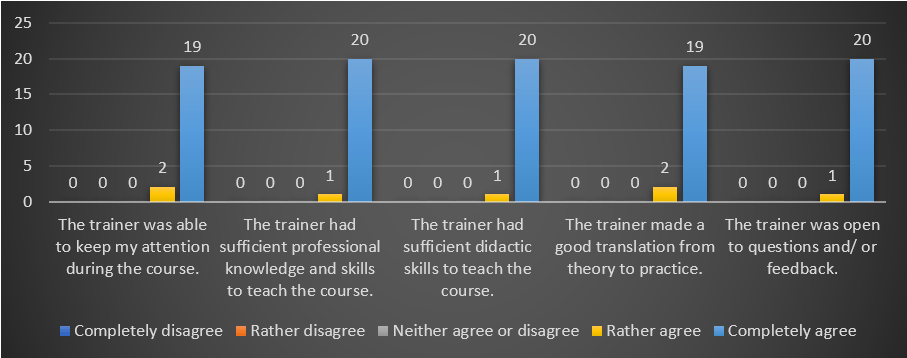 The participants were extremely positive about the trainer. They found that the trainer was able to keep their attention during the course and was open to questions and feedback. The trainer is seen as someone with sufficient professional knowledge and didactic skills to teach the course and someone who made good translations from theory to practice.