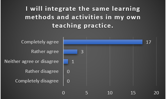There is also a consensus that the course was cohesive and had a logical structure. Moreover, the participants indicate that the teaching methods were well-chosen and in line with the goals of the course. Not surprisingly, almost all the participants moreover indicated that the applied learning methods and activities were inspiring for their own teaching practice. Only two participants responded with (neither agree nor disagree). Moreover, twenty of the twenty-one participants (one respondent had no opinion) argued that they will integrate the content and the learning methods and activities in their own practice.