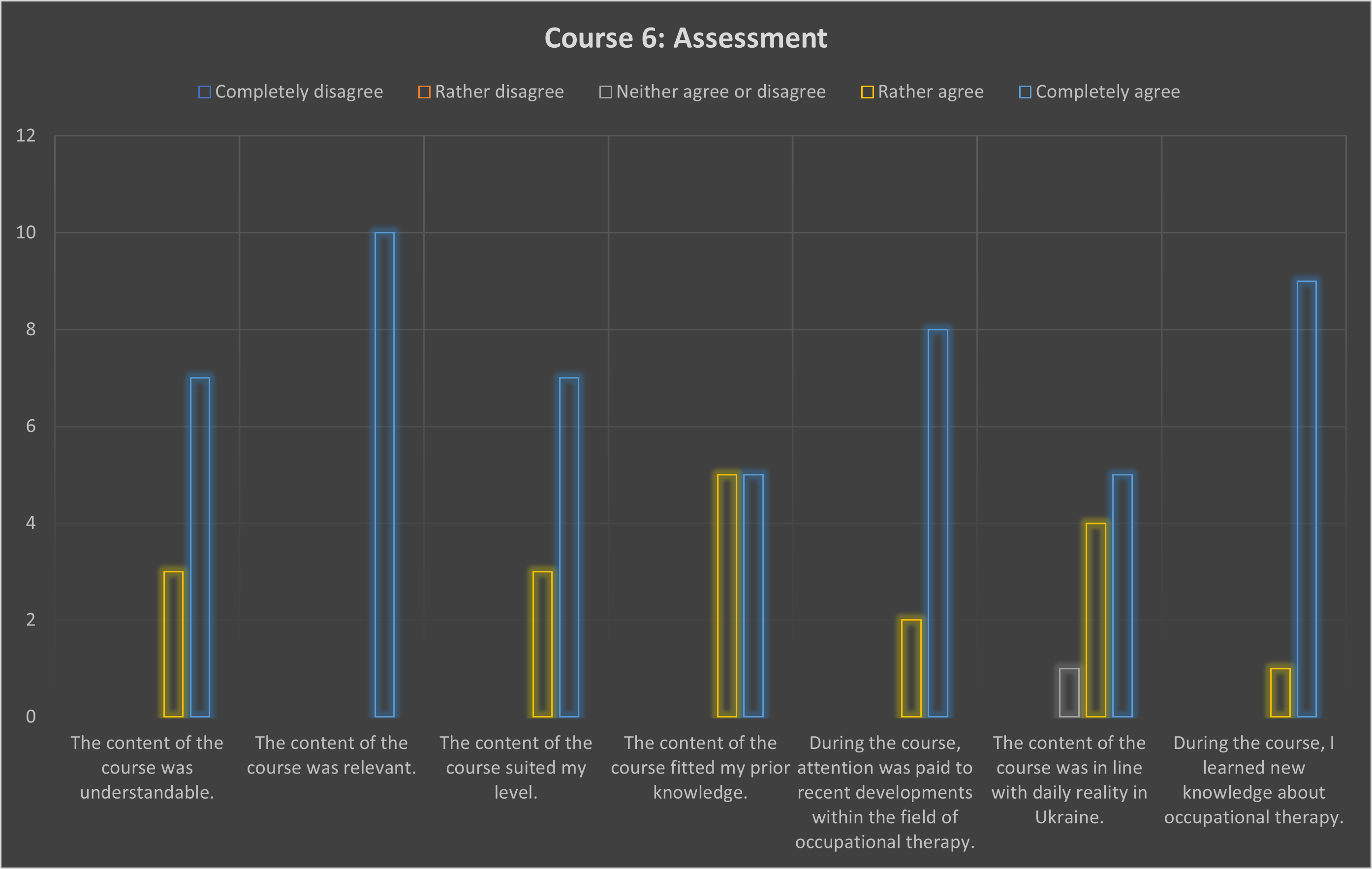 The participants agreed that the content of the course suited their level well and found that the content fitted their prior knowledge. They also mention that attention was paid to recent developments withing the field of occupational therapy during the course. Not surprisingly, they indicated that they learned new knowledge about occupational therapy and that they will integrate the course content and learning methods and activities in their own teaching practice. All the participants perceived the applied learning methods and activities as inspiring for their own teaching practice. The majority of the participants indicated that the content of the course was in line with the daily reality in Ukraine. Only 10% had no real opinion about it (and responded with neither agree or disagree).